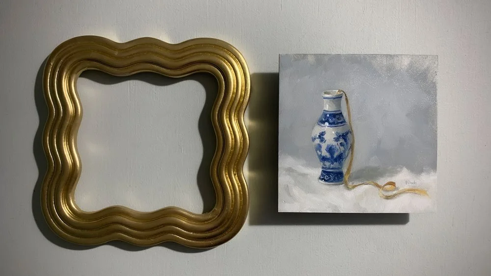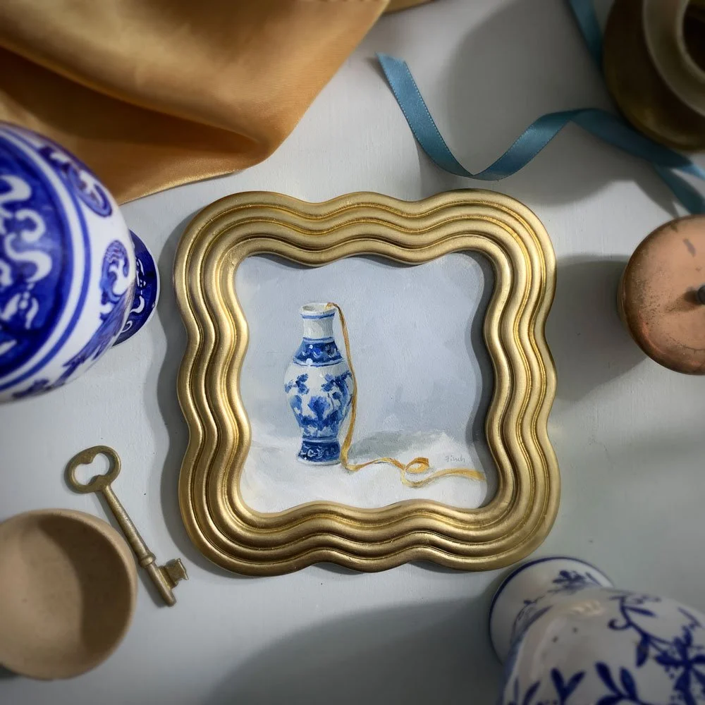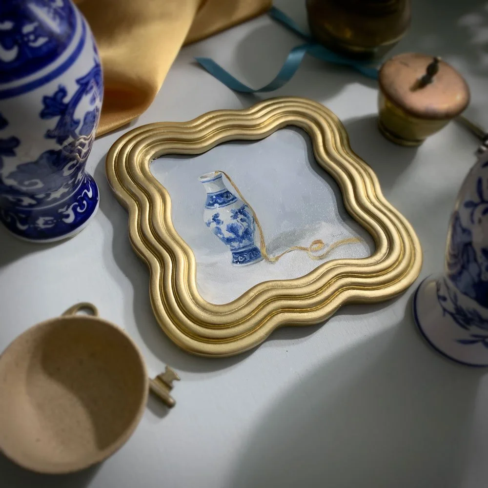 Japan’s blue and white porcelain was developed during the Edo Dynasty and the gold touches in the painting and frame represent Kintsugi, the Japanese technique of repairing broken pottery with gold.