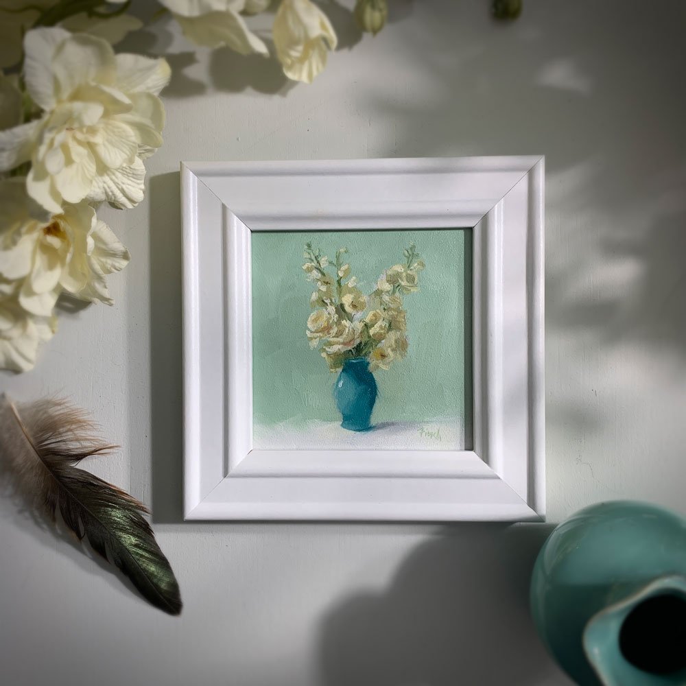 In my mind, Vincent and I are painting the same still life with the same background, flowers and vase. And as we are different people and artists, we interpret what we see in our own style of painting. I love the soft green background, white flowers with thick paint and the intense teal vase. All hugged perfectly with a crisp white frame. This was truly a joy to paint.
