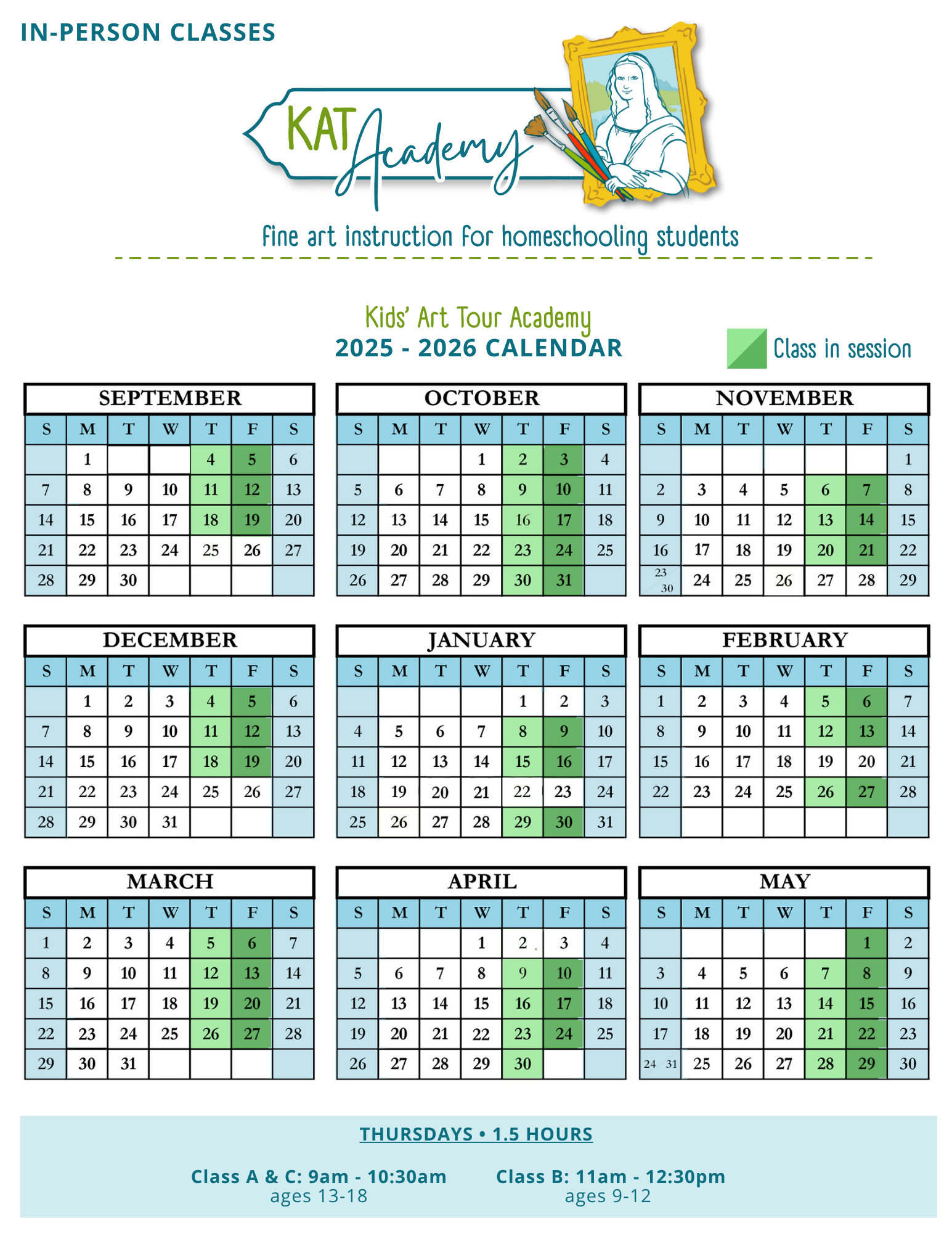 Class will meet on Thursdays for an hour and a half for 32 weeks (4 additional weeks in June are also an option). Including any work your child does outside of class, this will satisfy New York State art requirements for 4th - 12th grade homeschoolers.